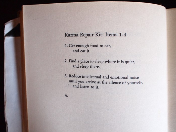 And just before we go, here is the poem that Richard didn’t have time for, Richard Brautigan’s Karma Repair Kit; Items 1-4…the poem that got away!