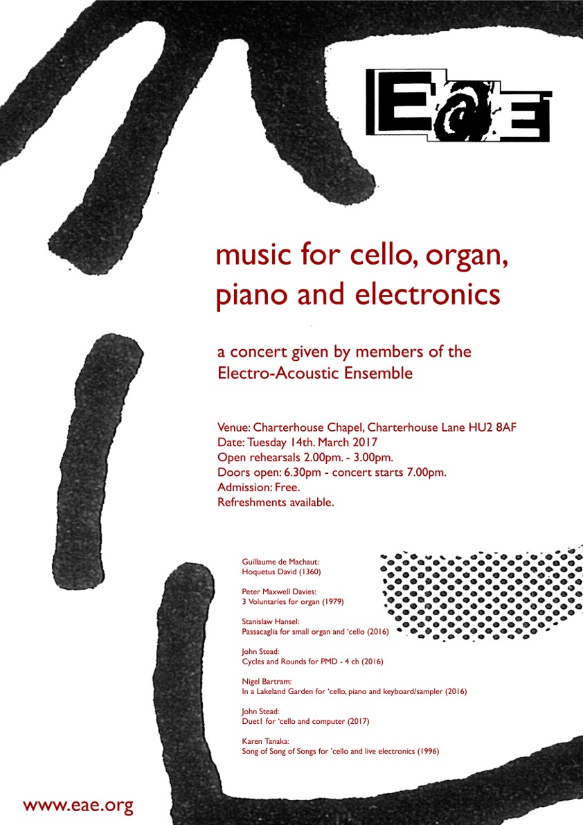 Thanks to our friend John Stead for inviting us to a special evening concert – the Electro-Acoustic Ensemble’s acousmatic performance of music for cello, organ, piano and electronics in Hull’s Charterhouse Chapel. Members of the EAE – Nigel Bartram (cello), John Stead (electronics), Stanislaw Hansel (organ, piano and sampler) – performed an adventurous and beautiful concert in the most atmospheric candlelit chapel. Pieces ranged from Guillaume de Marchaut’s 12th century Hoquetus David to Japanese American composer Karen Tanaka’s 1996 song of love interspersed with world premieres of new pieces by EAE members including tributes to Peter Maxwell Davies on the first anniversary of his death.