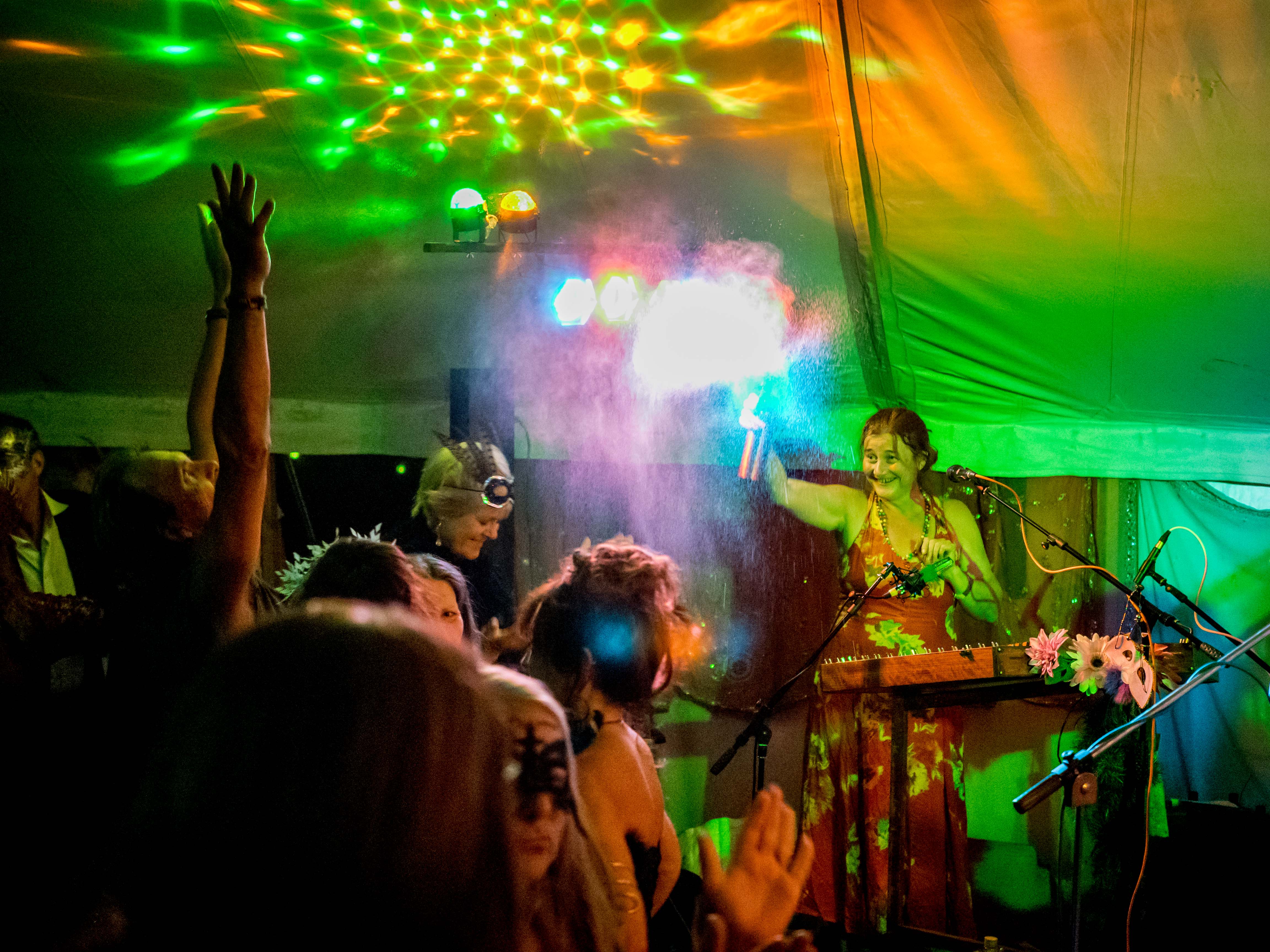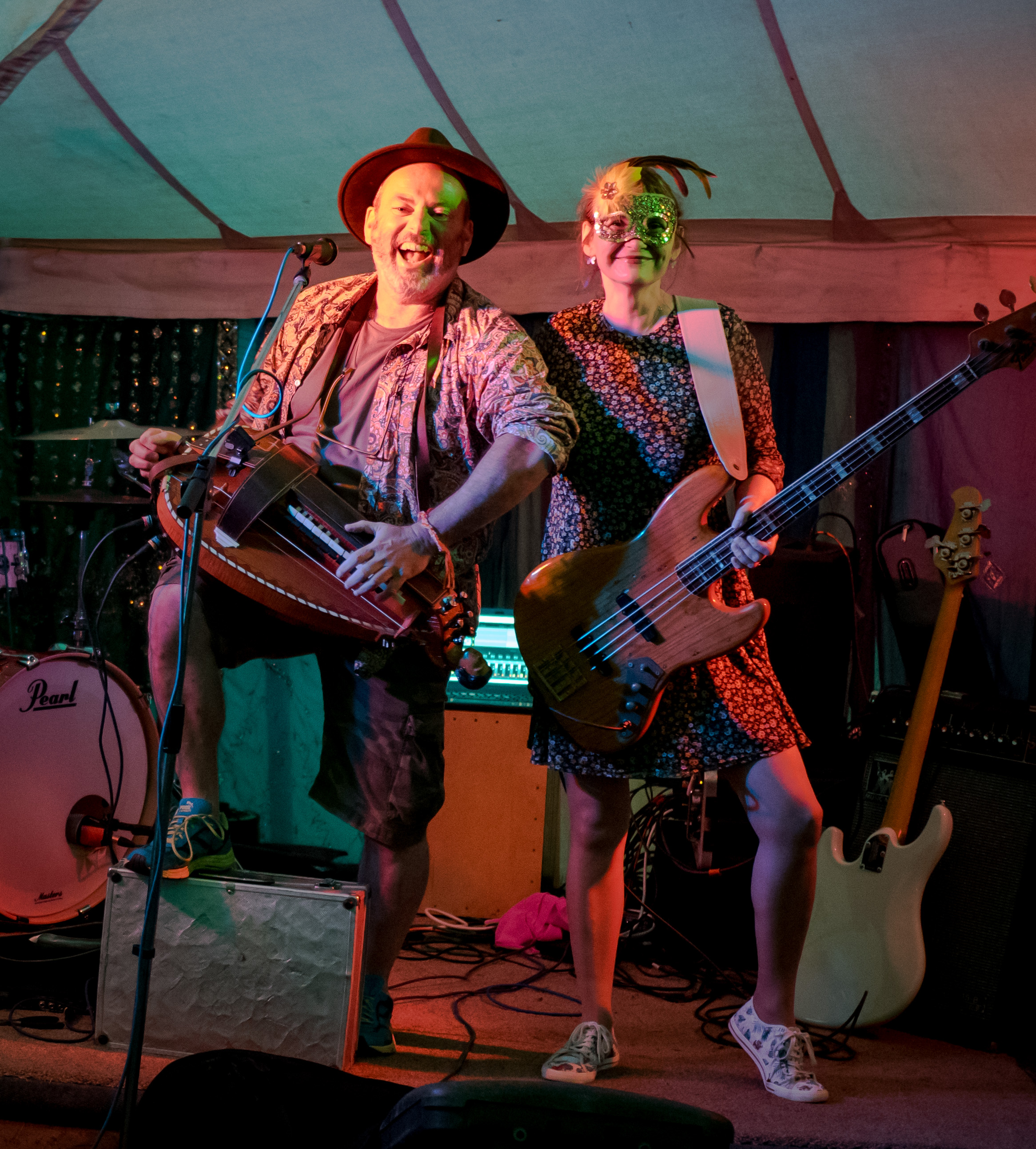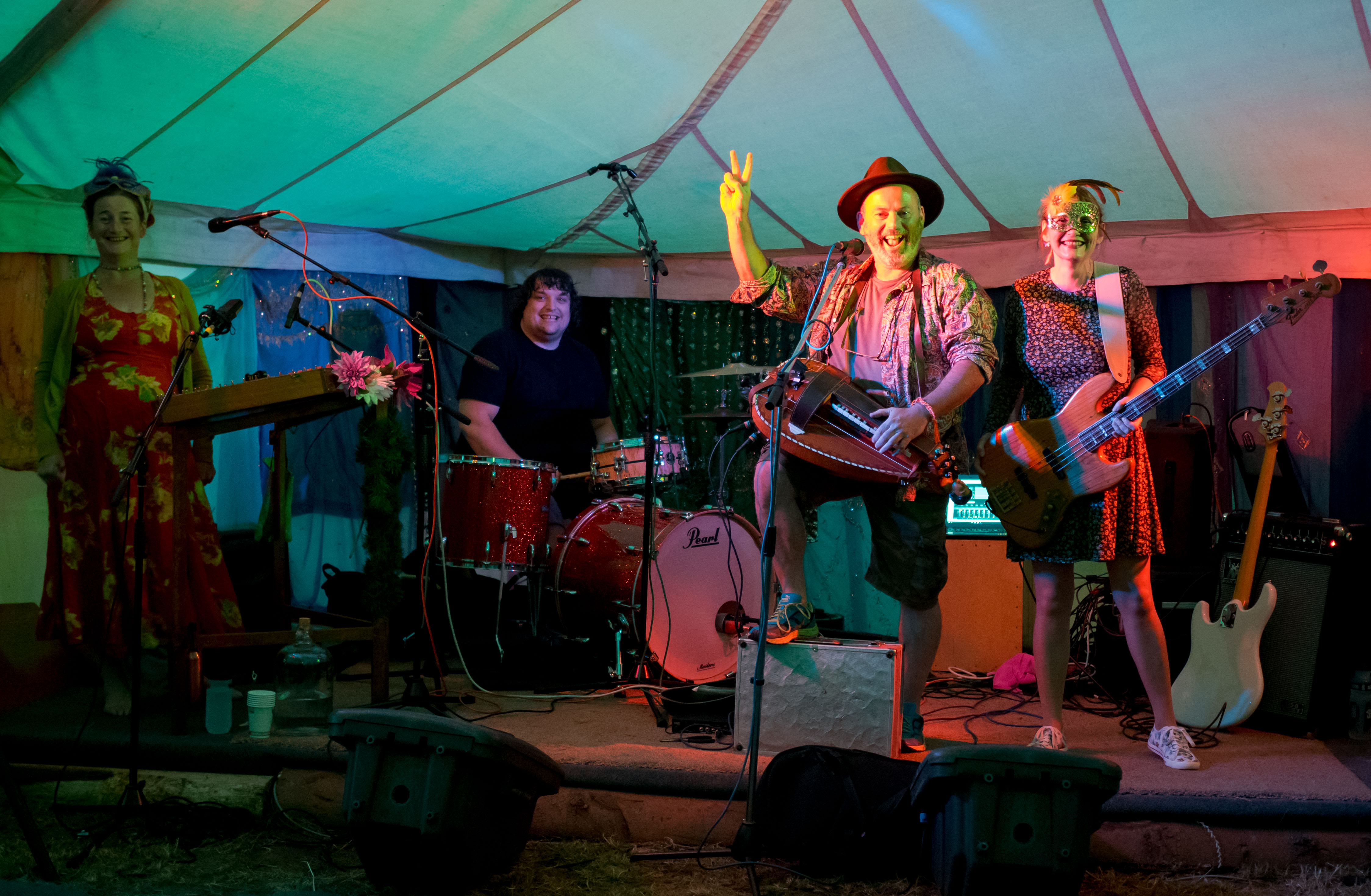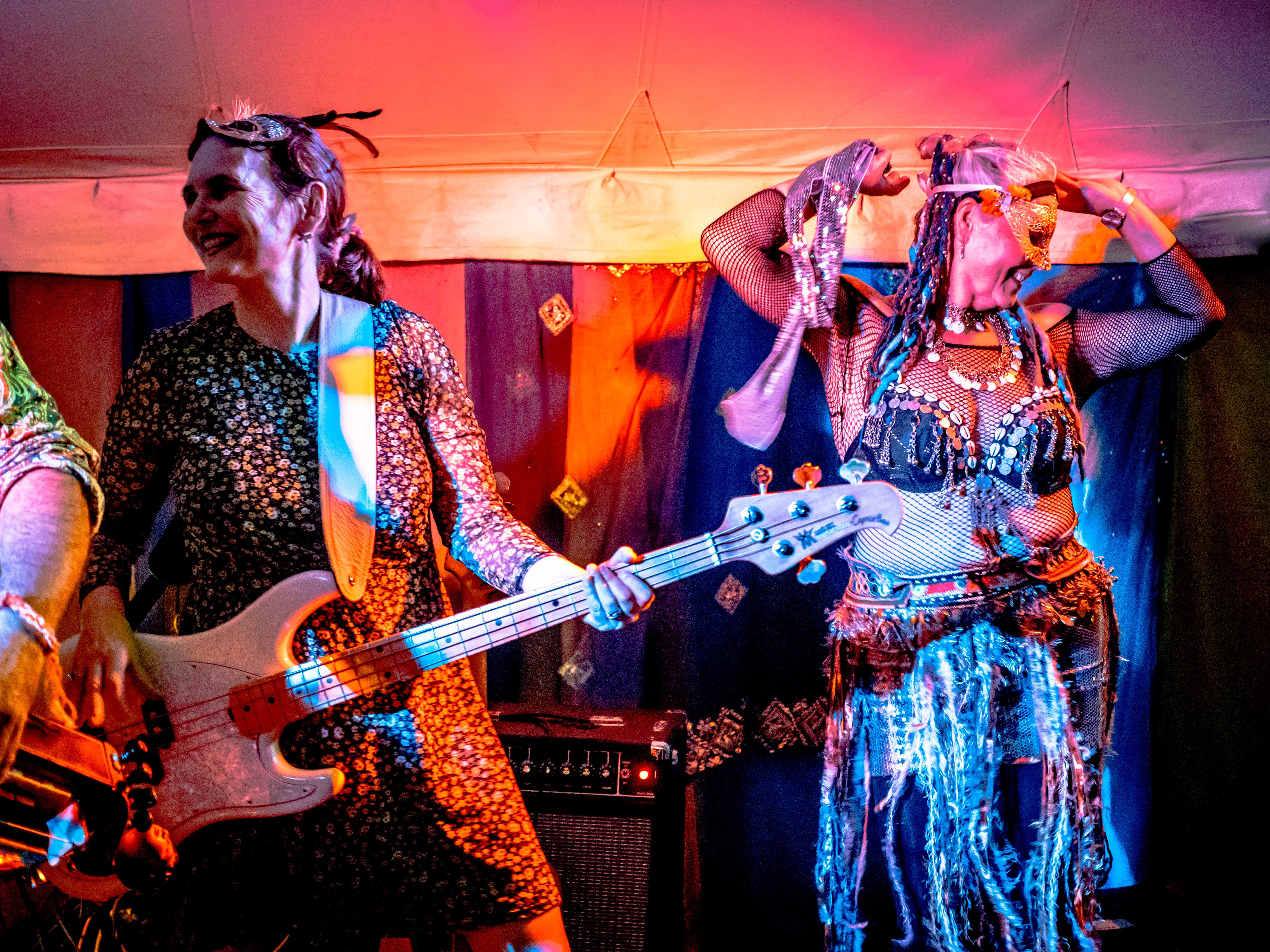 The last of a terrific set of summer festival gigs with Celtarabia was at the Rainbow Summer Camp in Gloucestershire, a lovely peaceful gathering, reminiscent of the free festivals of yore. Celtarabia starred at the festival’s grand Masked Ball, what a marvellous experience. Superb dancing throughout the night and a fantastic vibe made for a brilliant time. Special thanks to sound engineer Joe who showed me his lovely vintage fretless Fender Jazz Bass. It was so cool I played it for most of the set. Cheers Joe!