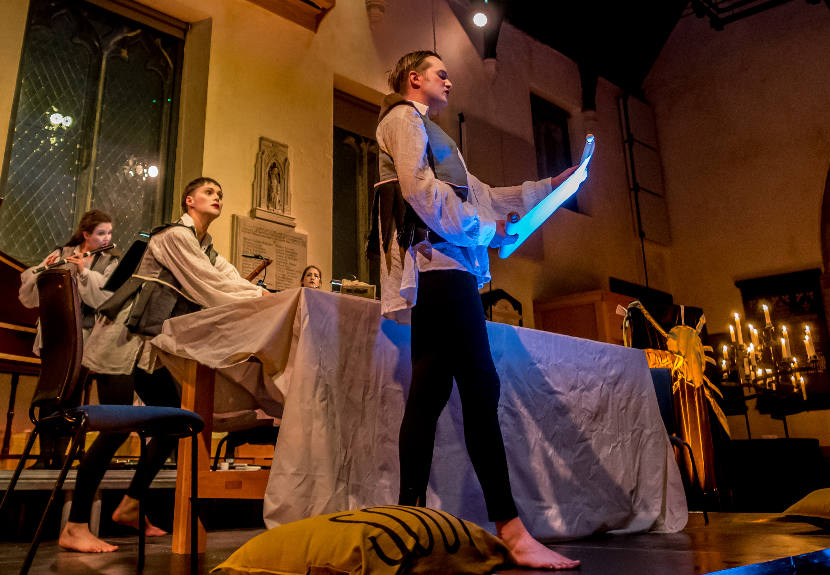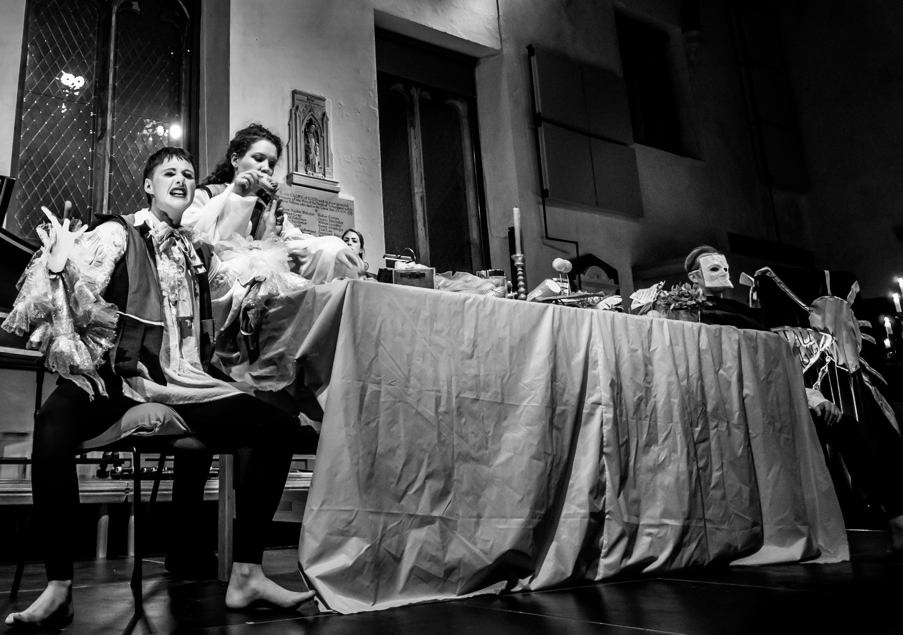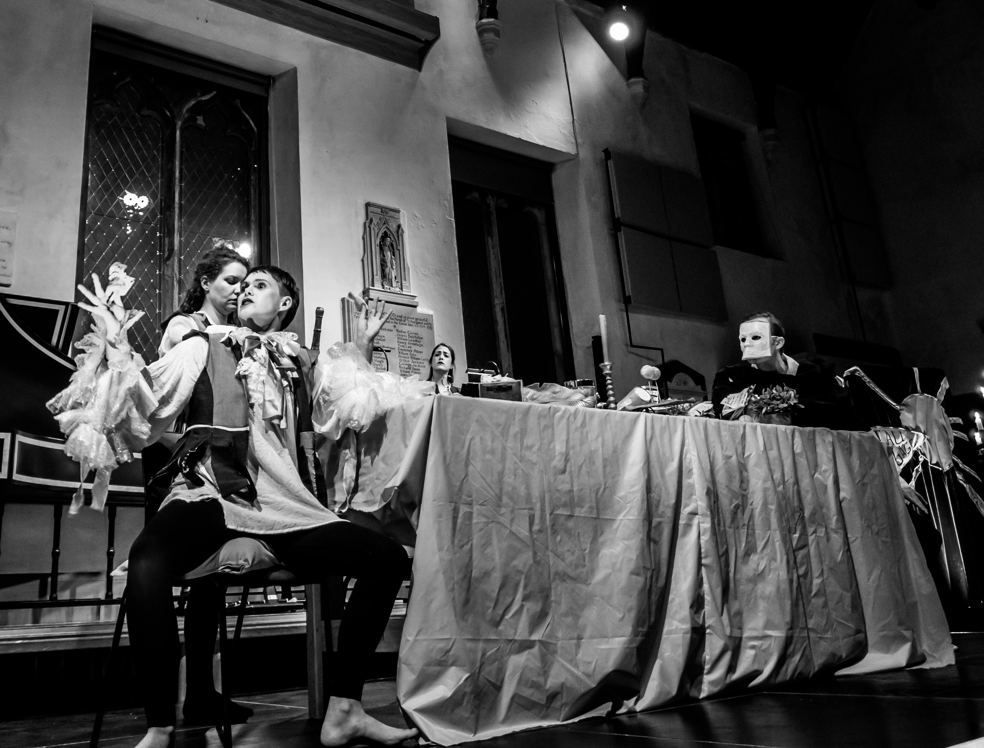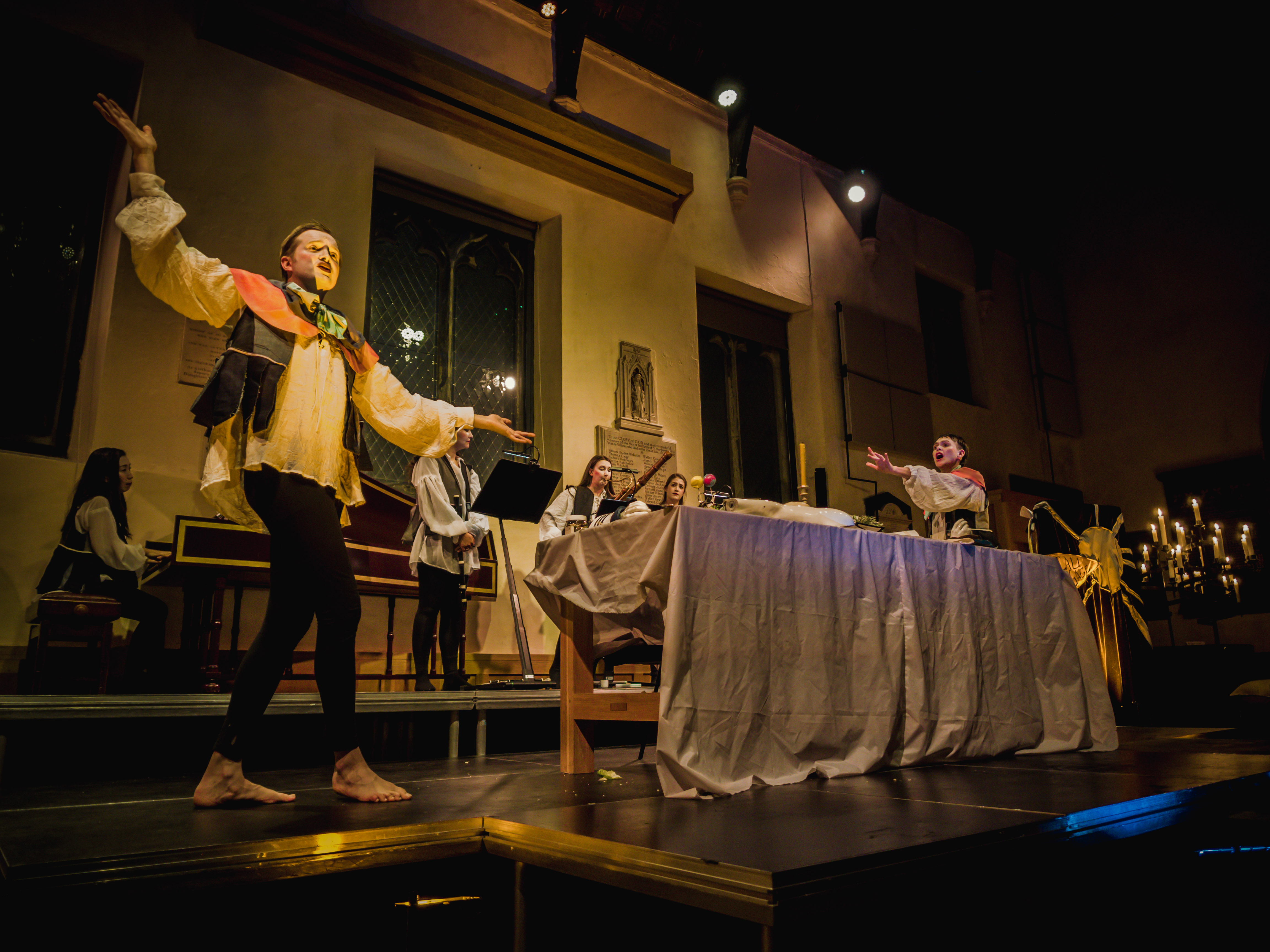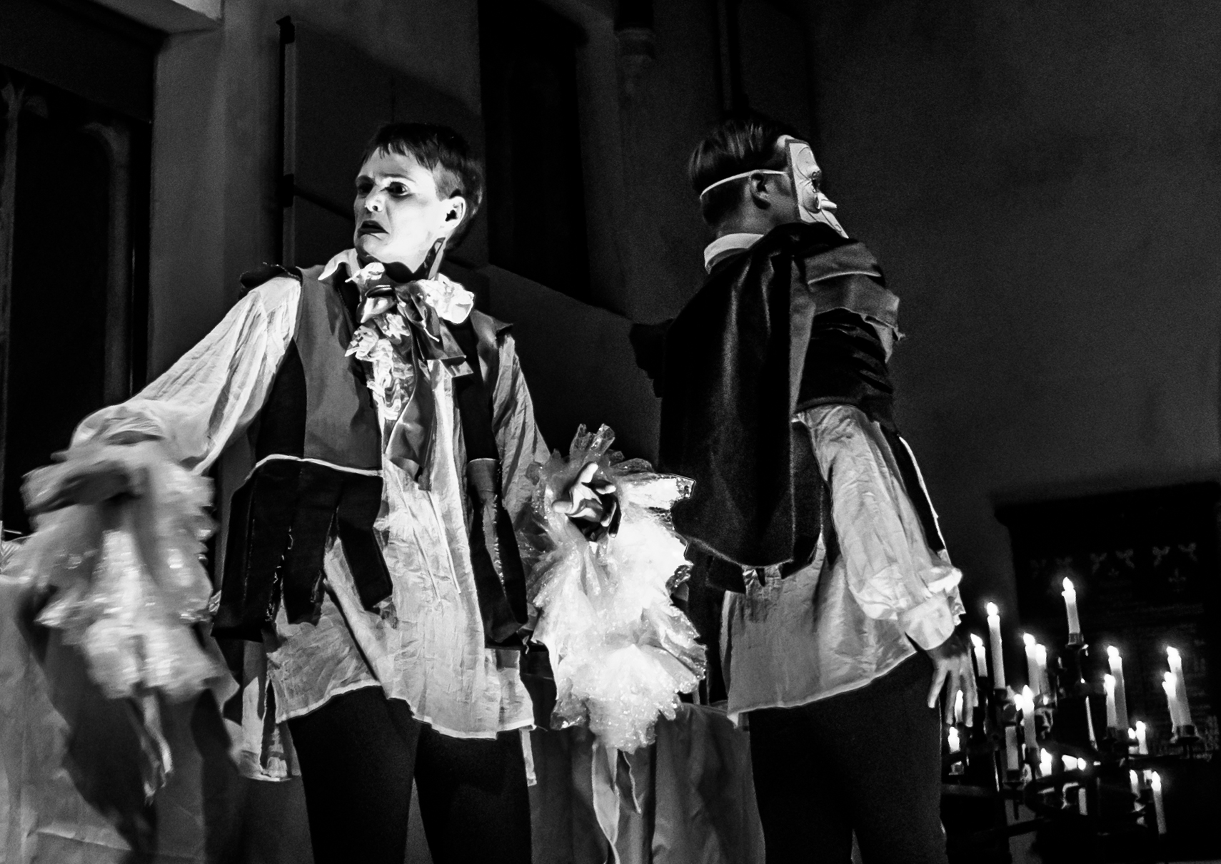 In a space and time not dissimilar to our own, where environmental catastrophe, popular upheaval, war and pestilence rage through the country, the king withdraws into a world of mirrors, spectacle and art. Two servants are trying to uphold the Molièrian idea of ‘decorum’ while performing multiple roles, singing and dancing around the king’s banquet table, until the world seeps into the dining hall.