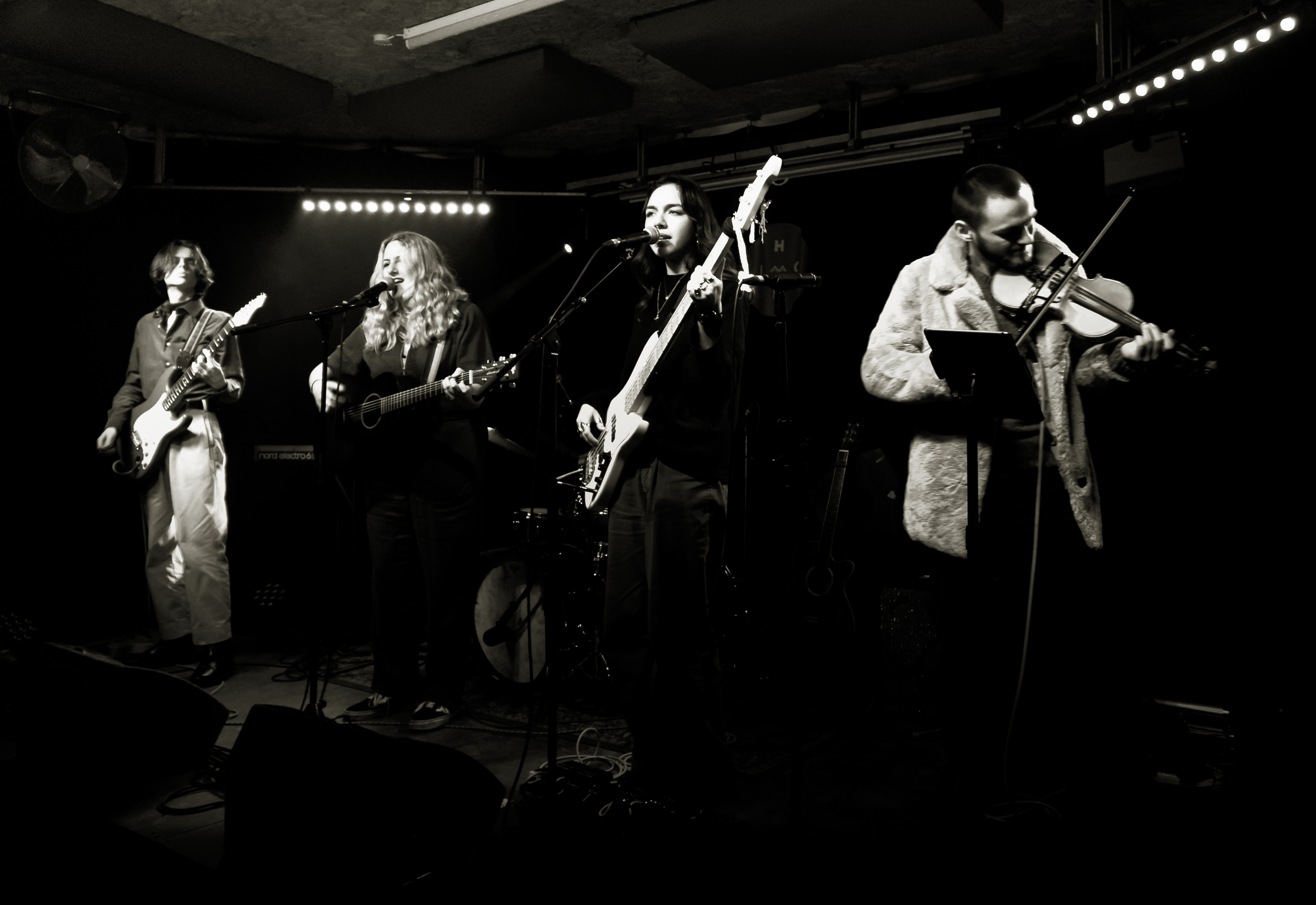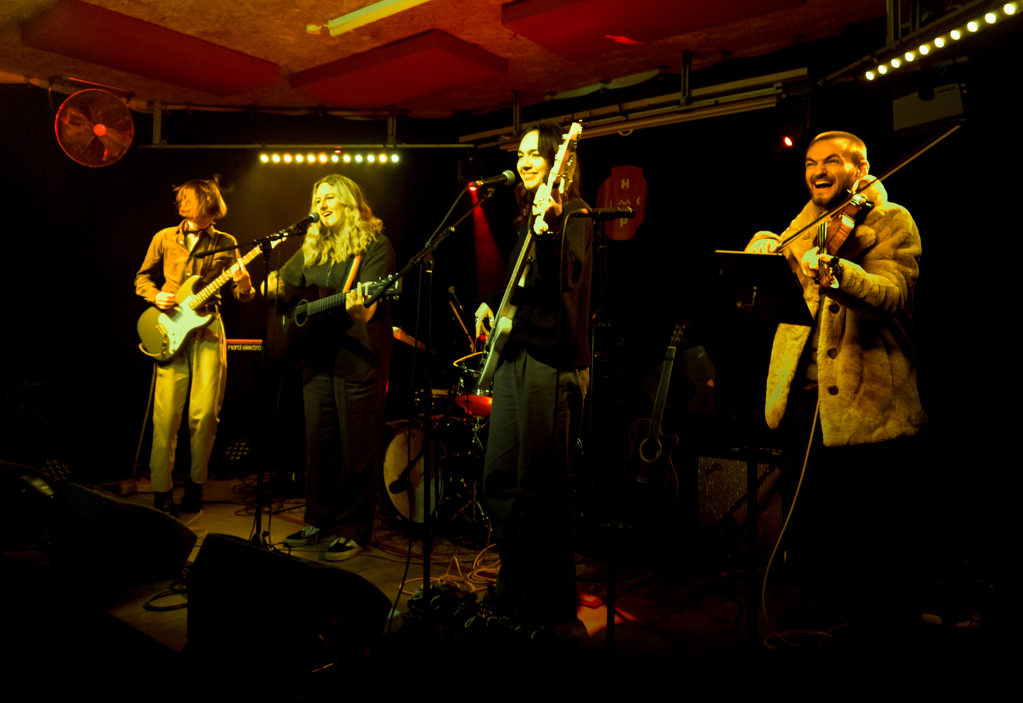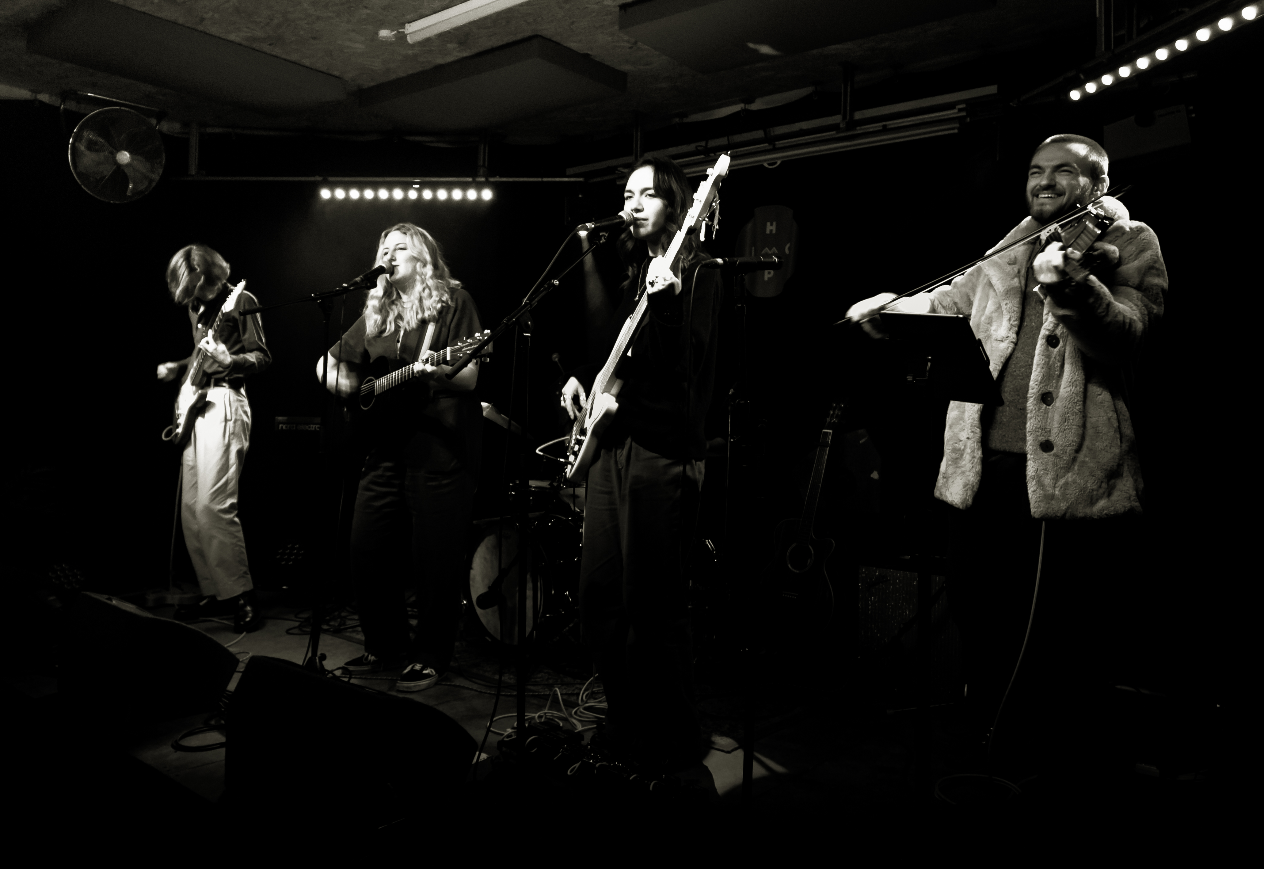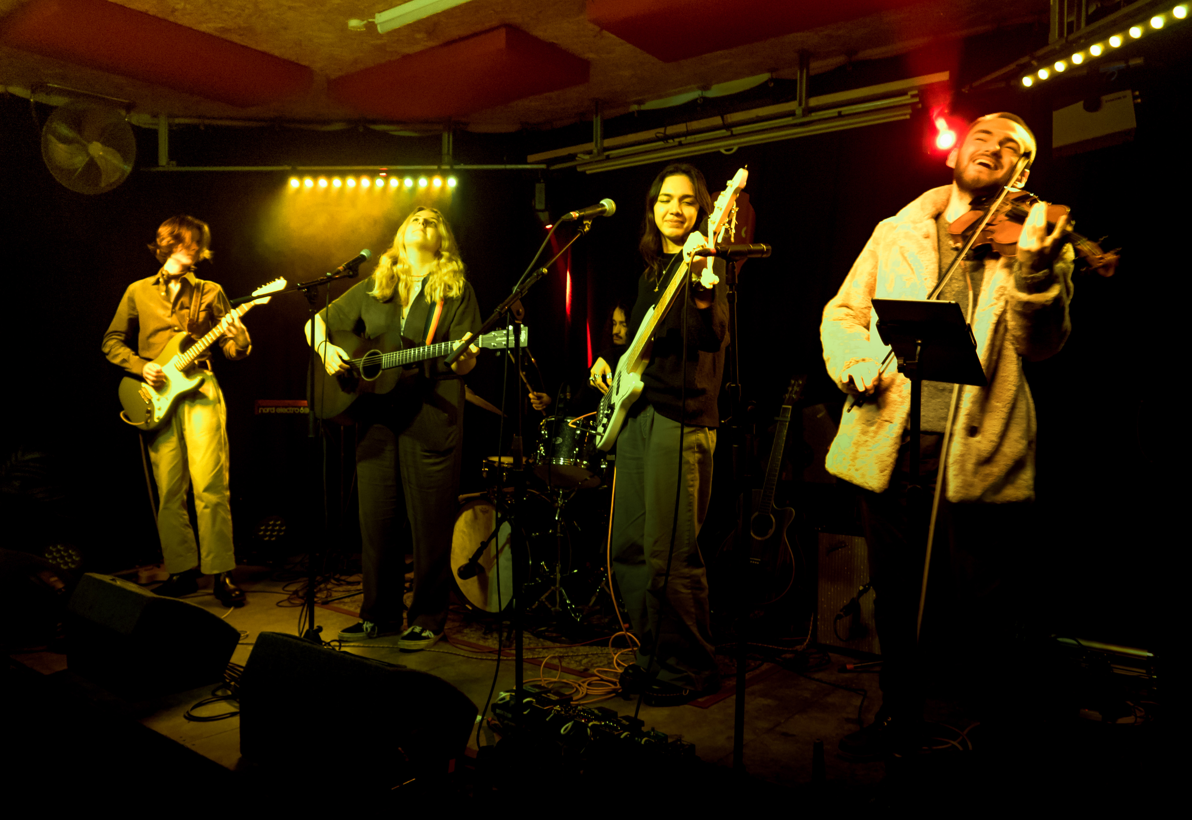 Dexter is having a ball in Leeds he’s got stuck into a bunch of excellent musical ventures. This is Anneka Shelley with her band, Poppy on bass, Callum guitar, Billy drums, Dexter violin and this time joined for one song by special guest Leona. They are 19, superb musicians & songs and playing top shows. We went to see them at the Hyde Park Book Club on Friday night, what a great gig. Rich took these photos.